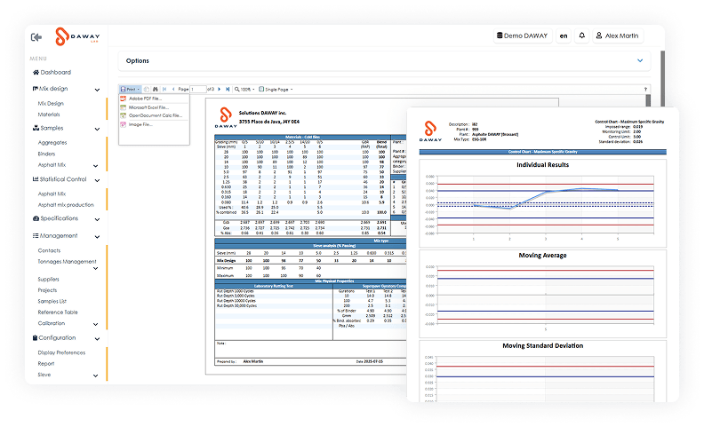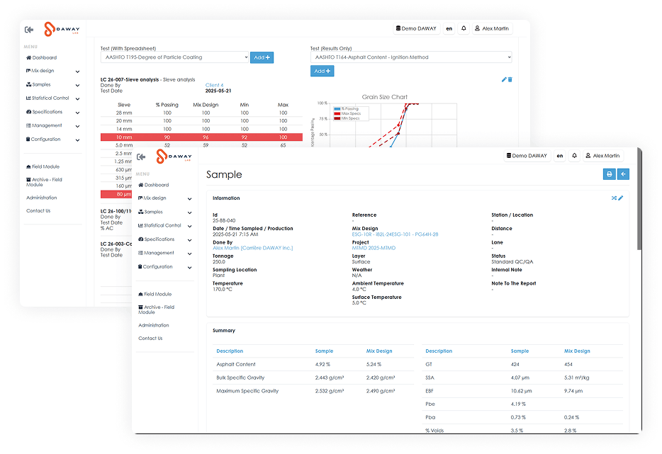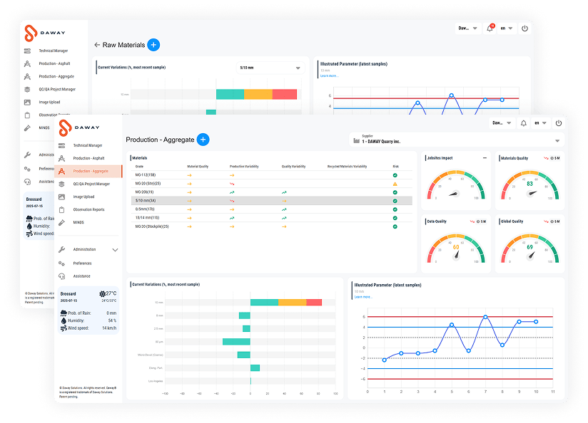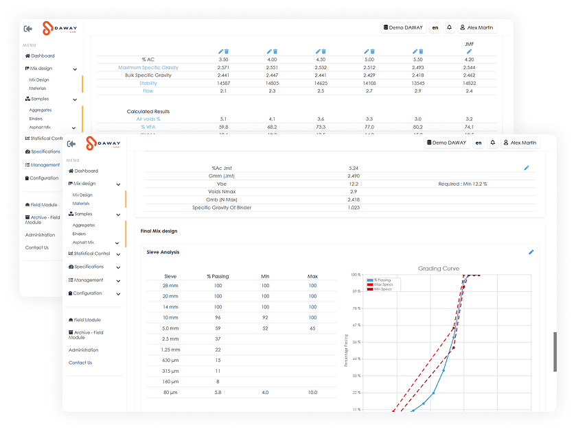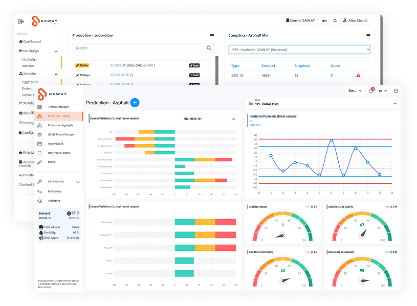 The DAWAY-Laboratory module ensures optimal control of your analysis, mix design, and validation processes, guaranteeing reliable and compliant materials at every phase of a project.